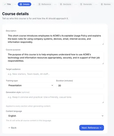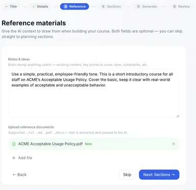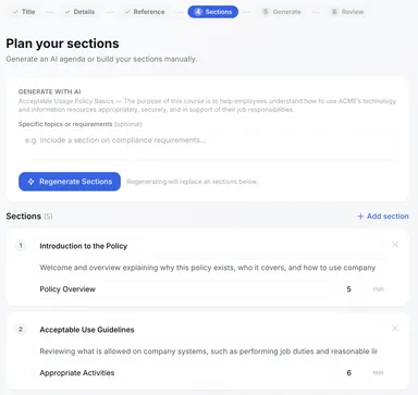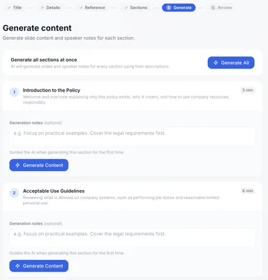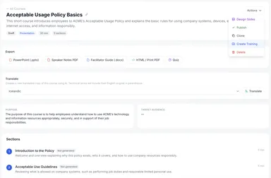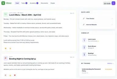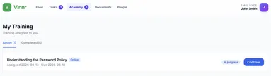 AI-Powered Training. HR admins describe a topic, upload reference materials, and Vinnr's AI generates a complete training course - structured content, slides, speaker notes, and a quiz. Courses are delivered through a built-in employee portal or exported to PowerPoint, PDF, or Word. What used to take days now takes minutes.
