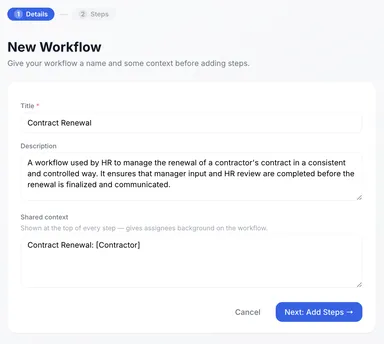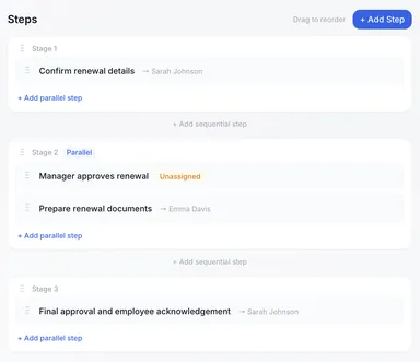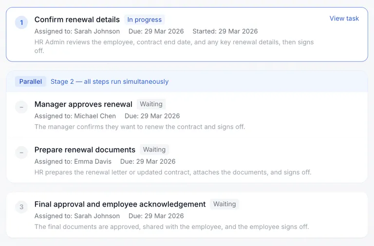 Tasks & Workflows. Onboarding checklists, policy acknowledgements, compliance tasks - HR admins create structured workflows with checklists and reference files; employees receive clear, actionable tasks with everything they need in one place.