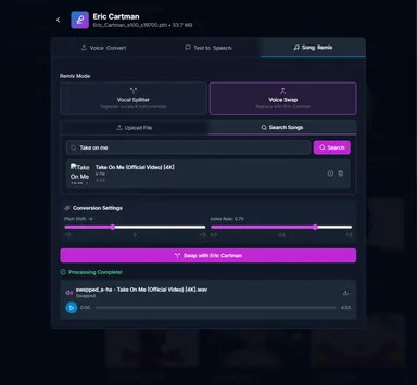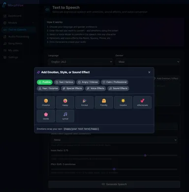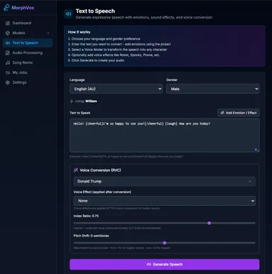 MorphVox — real-time voice conversion, TTS, and song voice-swap (RVC as a usable web platform)