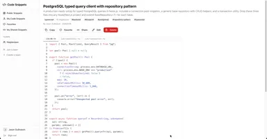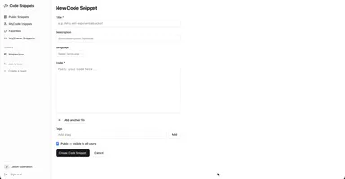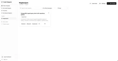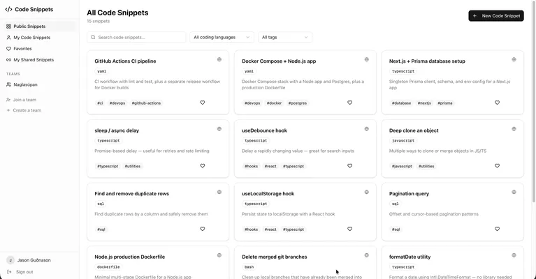 Snippet Manager is a developer tool for storing, organizing, and sharing code snippets in one place. Instead of losing useful code in Slack threads or scattered files, developers save snippets with a title, language, and tags — then find them instantly with full-text search and filters. Snippets can contain multiple files (blueprints), making it easy to document complete setups like wiring a database, configuring middleware, or bootstrapping a new service — all shown in a tabbed editor.